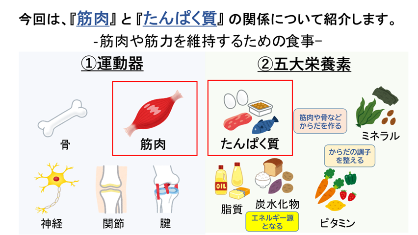 今回は、高齢期に重要な運動器として筋肉に注目し、なかでも加齢に伴い筋肉や筋力が低下するサルコペニアについて取り上げたいと思います。また、筋肉や筋力を維持するために必要な栄養素として、たんぱく質を中心に、日常生活における食事の進め方についてご紹介できればと思います(図1)。