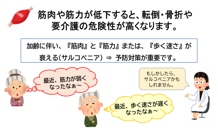 サルコペニアとは、加齢に伴い筋肉や筋力、歩く速さが衰える疾患です。これまでの、数多くの研究で、筋肉や筋力が低下した方は、転倒や骨折、要介護状態になりやすいことが報告されています(図2)。このような背景から、高齢期に向けて筋肉や筋力を減らさない、食事や運動などの予防対策は喫緊の課題になっています。日常生活の中で、『最近、筋力が減ったなあ』とか、『歩く速さが遅くなったなあ』と感じることがあれば、筋肉や筋力が低下した、サルコペニアの可能性があります。
