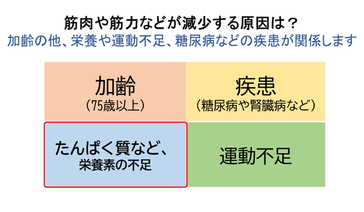 次は、筋肉や筋力が減少する4つの主な原因について紹介します(図3)。筋肉や筋力が減る原因として、最も多いのは年齢です。それ以外では、糖尿病や腎臓病といった病気の重症化や、運動不足、食事からのたんぱく質の不足が挙げられます。とくに75歳以上の方は、食欲が低下しやすく、食事からのたんぱく質の摂取不足に注意する必要があります。