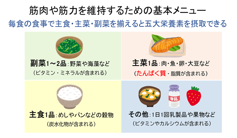 それでは、次に筋肉や筋力を維持するための基本的な食事メニューについて紹介します(図4)。食事の基本は、毎回の食事のなかに、主食、主菜、副菜を揃えて頂くことになります。例えば、野菜を中心とした副菜には、ビタミンやミネラル、魚や肉、卵、大豆といった主菜には、たんぱく質や脂質、米飯やパンなどの主食には、炭水化物といった栄養素が豊富に含まれています。さらに1日1回、食事に乳製品や果物を加えることで、5つの5大栄養素をまんべんなく摂取することができます。これは、成長期の子どもからサルコペニア予防の高齢期まで、全てのライフステージで共通している食事の基本メニューとなります。