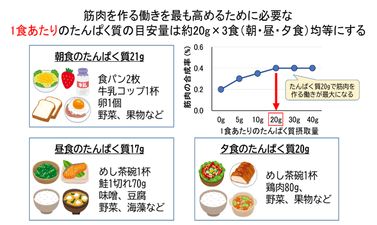 そして、動物性食品や植物性食品を多様に組み合わせて頂き、1食当たりのたんぱく質を20g前後に調整してみてください。毎回の食事のメニューのなかに、動物性食品と植物性食品の両方から、たんぱく質をバランスよく均等に組み合わせて頂くと、筋肉を作る働きはさらに高まります(図6)。