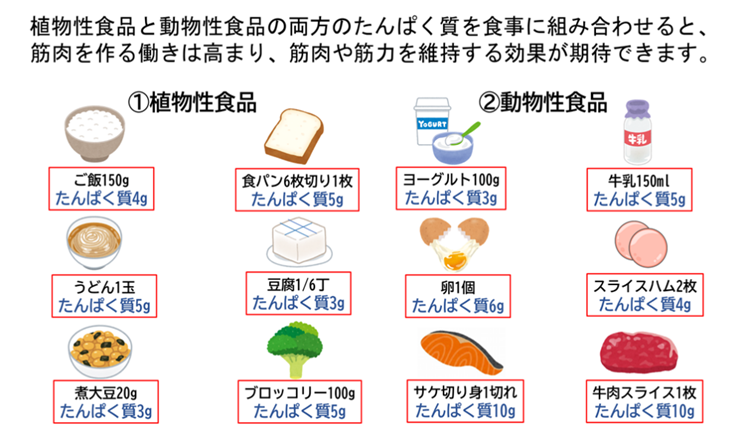 一方、朝ごはんで、めし茶碗1杯しか食べない方は、たんぱく質が16g不足します。そのため、魚の切り身1切れの他、みそ汁などで豆腐50g程度とって頂ければ、朝ごはんでたんぱく質を約17g摂取することが出来ます。食事の基本メニューは主食、主菜、副菜メニューですが、どうしても主食では、たんぱく質が不足してしまいます。筋肉や筋力を維持するためも、まずは1品だけでも良いので、比較的食べやすい食品などから、少しずつ、はじめてみてはいかがでしょうか。