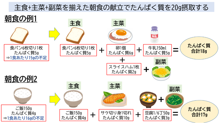 日本人が注意すべき食習慣の特徴として、朝ごはんからのたんぱく質の摂取量が少ないことが挙げられます。それでは、朝ごはんをもとに、たんぱく質を約20g摂取できる食事メニューを少し紹介します(図7)。例えば、習慣的に朝ごはんで食パン1枚しか、食べない方は、たんぱく質が15g不足しています。そのため、可能であれば、卵1個やスライスハム1枚、牛乳コップ1杯とって頂ければ、朝ごはんでたんぱく質を約18g摂取することができます。